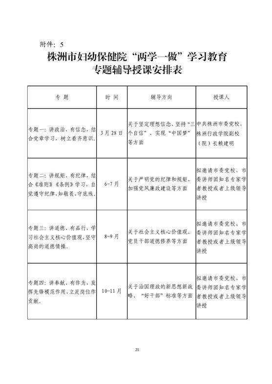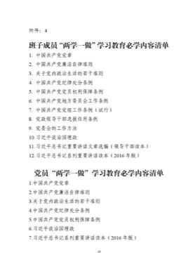 2.開展專題學(xué)習(xí)討論。堅(jiān)持把個(gè)人自學(xué)和集中學(xué)習(xí)結(jié)合起來,明確自學(xué)要求,引導(dǎo)黨員合理安排時(shí)間,讀原著、學(xué)原文、悟原理,認(rèn)真搞好個(gè)人自學(xué)。逐條逐句學(xué)習(xí)《中國共產(chǎn)黨黨章》,全面理解黨的綱領(lǐng),牢記入黨誓詞,牢記黨的宗旨,牢記黨員義務(wù)。黨支部委員會(huì)和黨小組要按照“三會(huì)一課”制度要求,制定全年學(xué)習(xí)計(jì)劃表,每月組織一次集中學(xué)習(xí);不設(shè)黨小組的,以黨支部為單位集中學(xué)習(xí)。黨支部每 2個(gè)月召開一次全體黨員會(huì)議,每次圍繞一個(gè)專題開展學(xué)習(xí)討論。黨員分散、人數(shù)較多的黨支部,可分組開展學(xué)習(xí)討論。學(xué)習(xí)討論重點(diǎn)圍繞“四個(gè)專題”進(jìn)行:專題一(4-5 月),以“講政治、有信念”為主要內(nèi)容。結(jié)合學(xué)習(xí)黨章和習(xí)近平總書記關(guān)于堅(jiān)定理想信念、堅(jiān)持“三個(gè)自信”、實(shí)現(xiàn)“中國夢(mèng)”等方面的論述進(jìn)行深入討論,重點(diǎn)看能否堅(jiān)守共產(chǎn)黨人信仰信念,自覺向黨中央看齊,向黨的理論和路線方針政策看齊;能否牢記黨的宗旨,踐行群眾路線,密切與群眾的血肉聯(lián)系;能否正確處理公與私、義與利、個(gè)人與組織、個(gè)人與群眾的關(guān)系;能否認(rèn)真履行黨員的義務(wù)。專題二(6-7月),以“講規(guī)矩、有紀(jì)律”為主要內(nèi)容。結(jié)合學(xué)習(xí)《關(guān)于黨內(nèi)政治生活若干準(zhǔn)則》《中國共產(chǎn)黨廉潔自律準(zhǔn)則》《中國共產(chǎn)黨紀(jì)律處分條例》《中國共產(chǎn)黨黨員權(quán)利保障條例》《中國共產(chǎn)黨地方委員會(huì)工作條例》《黨政領(lǐng)導(dǎo)干部選拔任用工作條例》和習(xí)近平總書記關(guān)于嚴(yán)明黨的紀(jì)律和規(guī)矩、加強(qiáng)黨風(fēng)廉政建設(shè)等方面的論述以及有關(guān)警示教育典型案例進(jìn)行深入討論,重點(diǎn)看能否嚴(yán)格遵守黨的政治紀(jì)律、組織紀(jì)律、廉潔紀(jì)律、群眾紀(jì)律、工作紀(jì)律和生活紀(jì)律,能否自覺做到在黨規(guī)黨紀(jì)面前知敬畏、守底線。專題三(8-9 月),以“講道德、有品行”為主要內(nèi)容。結(jié)合學(xué)習(xí)習(xí)近平總書記關(guān)于社會(huì)主義核心價(jià)值觀、黨員干部道德修養(yǎng)等方面的論述進(jìn)行深入討論,重點(diǎn)看能否帶頭踐行社會(huì)主義核心價(jià)值觀,能否堅(jiān)守高尚的道德情操,能否保持積極健康的生活方式。專題四(10-11月),以“講奉獻(xiàn)、有作為”為主要內(nèi)容。結(jié)合學(xué)習(xí)習(xí)近平總書記關(guān)于治國理政的新思想新戰(zhàn)略、“好干部”標(biāo)準(zhǔn)等方面論述以及先進(jìn)典型的優(yōu)秀事跡進(jìn)行深入討論,重點(diǎn)看能否自覺提升服務(wù)四個(gè)全面戰(zhàn)略布局、踐行五大發(fā)展理念的能力和水平,能否保持良好精神狀態(tài)、積極為黨的事業(yè)擔(dān)當(dāng)作為,能否立足崗位作貢獻(xiàn)、發(fā)揮先鋒模范作用。對(duì)于非中共黨員干部職工,也要組織起來學(xué)習(xí)習(xí)近平總書記的系列重要講話,將全體干部職工的思想統(tǒng)一到黨中央的治國理政新理念上來,統(tǒng)一到省委、市委工作部署上來,統(tǒng)一到“健康株洲”建設(shè)上來;對(duì)于入黨積極分子,可引導(dǎo)其主動(dòng)學(xué)習(xí)黨紀(jì)黨章,積極向黨看齊。