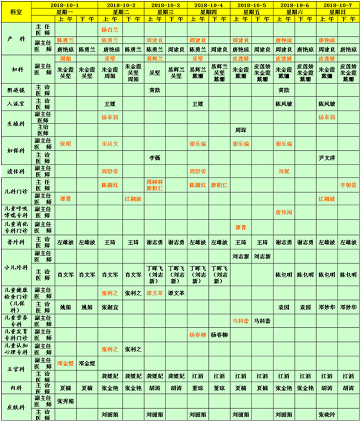 國慶節(jié)期間產(chǎn)科、婦科、普外科、小兒外科、五官科、內(nèi)科門診國慶節(jié)期間全天開放;婦保科、皮膚科門診國慶節(jié)期間每日上午開放;陰道鏡10月3日、6日上午開放;人流室10月2日、4日、6日、7日上午開放; 生殖科10月2日、5日、7日上午開放;遺傳科10月2日、4日、6日上午開放;兒科門診10月1日、3日上午,10月2日、4日、7日全天開放;兒童消化專科門診10月5日上午開放;兒童呼吸哮喘??崎T診10月6日上午開放;兒保科門診10月1日、2日、3日、6日、7日全天開放;兒童認知心理專科門診10月2日全天開放;兒童發(fā)育專科門診10月4日全天開放;兒童營養(yǎng)??崎T診10月5日全天開放。