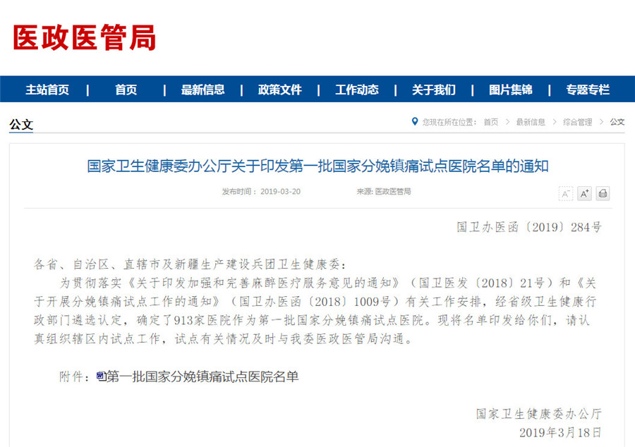 2019年3月20日,國家衛(wèi)生健康委發(fā)布《關(guān)于印發(fā)第一批國家分娩鎮(zhèn)痛試點醫(yī)院名單的通知》,全國共有913家醫(yī)院入選,其中,我市有3家醫(yī)院入此次試點醫(yī)院,我院位列其中,成功入選第一批國家分娩鎮(zhèn)痛試點醫(yī)院。