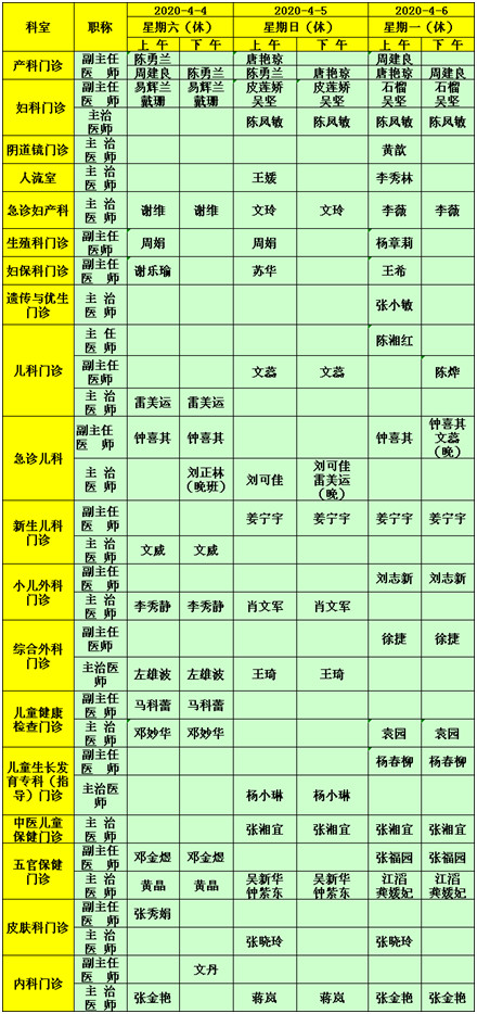 清明節(jié)放假期間婦科、產(chǎn)科、婦產(chǎn)科急診、兒科門急診、新生兒科、內(nèi)科、外科、兒??啤⑽骞倏崎T診均正常開診;生殖科、婦???、皮膚科每天上午開診;4月5日上午、4月6日上午開放人流室;4月6日上午開放陰道鏡及遺傳優(yōu)生門診。