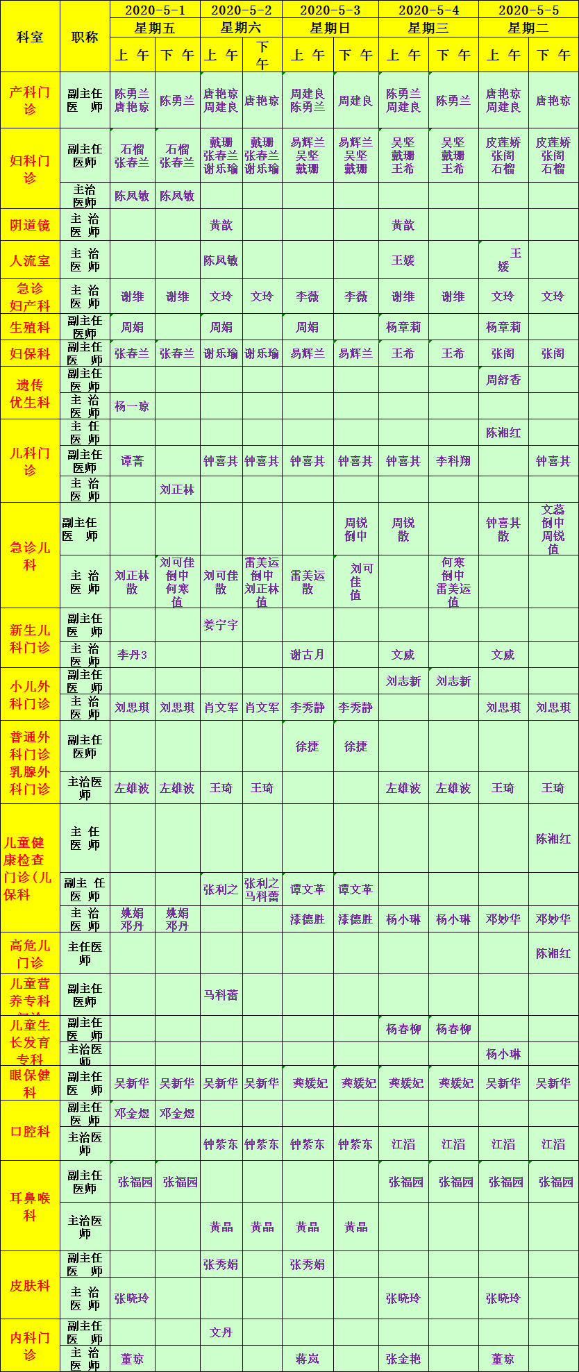 五一勞動(dòng)節(jié)期間,產(chǎn)科、婦科、急診婦產(chǎn)科、兒科門急診、小兒外科、普通外科、婦???、兒保科、眼保健、耳鼻喉科、口腔門診全天開放;生殖科、新生兒科、皮膚科及內(nèi)科每天上午開診;陰道鏡室5月2日及4日上午開放;人流室5月2日、4日、5日上午開放;遺傳優(yōu)生科5月1日、5日上午開放。