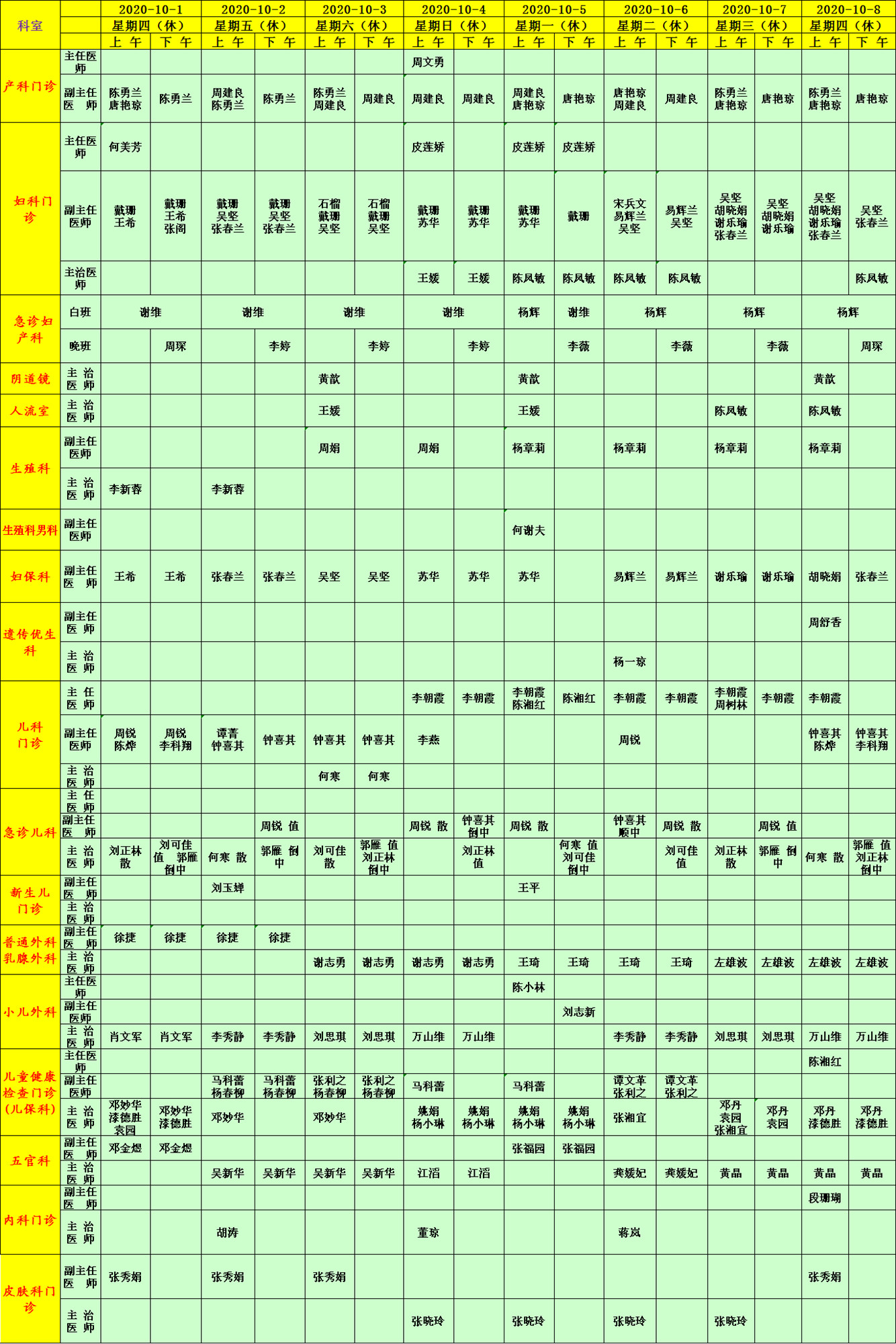 中秋國(guó)慶節(jié)假期間,小兒外科、普通外科、乳腺外科、婦科、產(chǎn)科、急診婦產(chǎn)科、兒科門急診、兒保科、五官科全天開放;婦???0月1日-4日、10月6日、7日全天開放,10月5日上午開診;新生兒科10月2日、10月5日上午開診;遺傳優(yōu)生科10月6日、8日上午開放;內(nèi)科門診10月2日、4日、6日、8日上午開放,陰道鏡室10月3日、5日、8日上午正常開放;生殖科每日上午開放,生殖男科10月5日上午開放;人流室10月3日、5日、7日、8日上午開放;皮膚科門診每日上午開診。