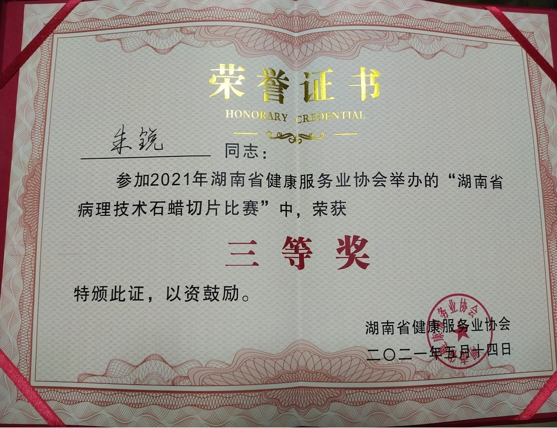 2021年5月14-16日,第二屆湖湘腫瘤病理診斷新進展高峰論壇暨湖南省健康服務(wù)業(yè)協(xié)會病理分會(2021)年會在長沙召開,同期舉辦了2021年湖南省病理技術(shù)石蠟切片比賽,我院病理科朱銳同志榮獲“三等獎
