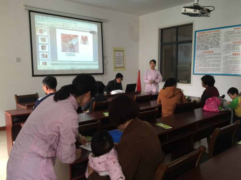 小兒外科護(hù)士長凌晶和醫(yī)護(hù)人員在茨菇塘衛(wèi)生服務(wù)中心進(jìn)行常見小兒外科疾病防治的知識講座